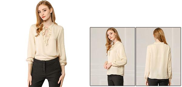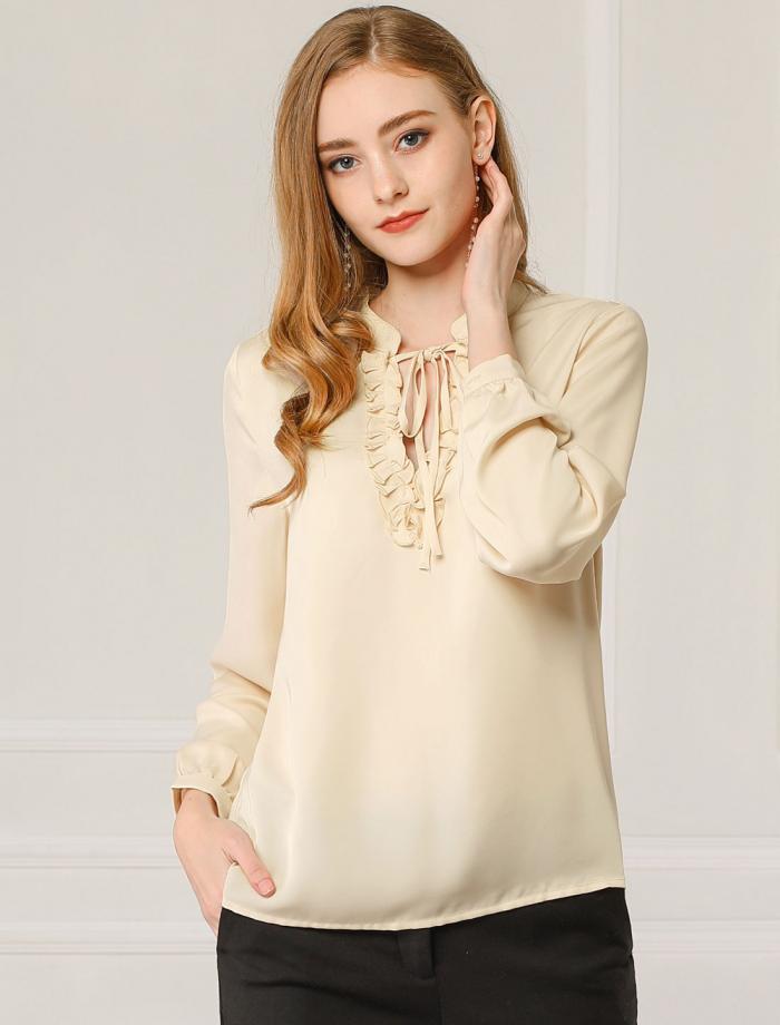 【商品説明】前フリル飾り、スプリットVネック、ボウタイネック、長袖、無地、裏地なしフリルは定番のブラウスの襟元と袖口に飾ってフェミニンなディテールを追加します。