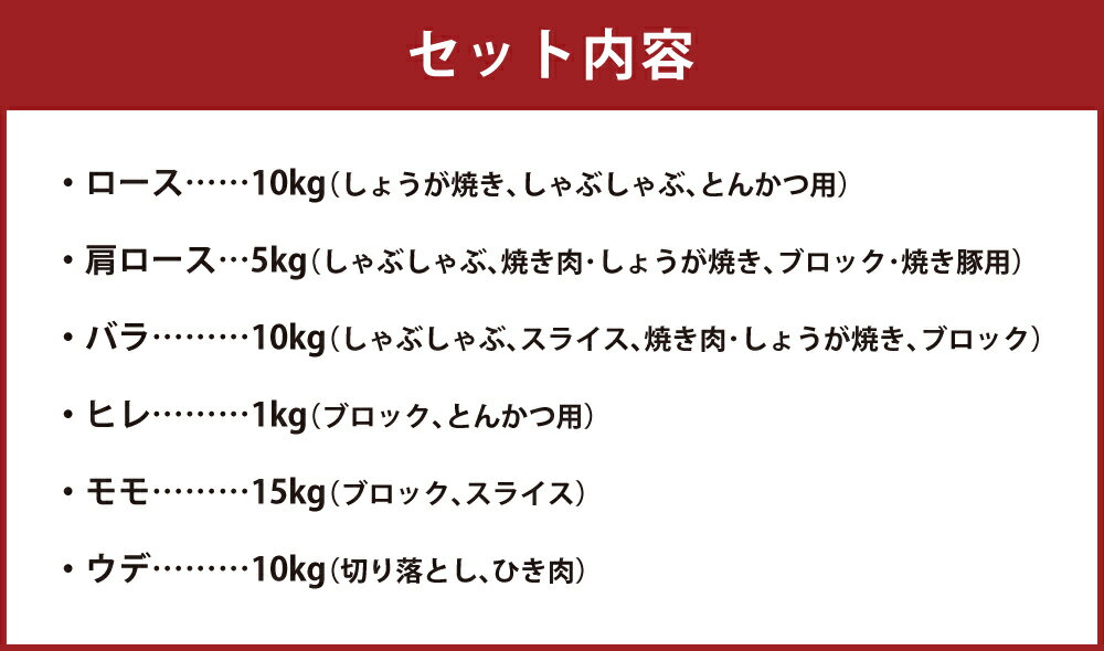商品説明 名称 折爪三元豚・佐助まるっと1頭 産地 岩手県 内容量 ・ロース:10kg(しょうが焼き、しゃぶしゃぶ、とんかつ用) ・肩ロース:5kg(しゃぶしゃぶ、焼き肉・しょうが焼き、ブロック・焼き豚用) ・バラ:10kg(しゃぶしゃぶ、スライス、焼き肉・しょうが焼き、ブロック) ・ヒレ:1kg(ブロック、とんかつ用) ・モモ:15kg(ブロック、スライス) ・ウデ:10kg(切り落とし、ひき肉) 消費期限 発送日より5日以内 保存方法 4℃以下で保存して下さい 提供者 久慈ファーム有限会社 商品説明 二戸市が誇るブランド豚肉、「折爪三元豚 佐助」。