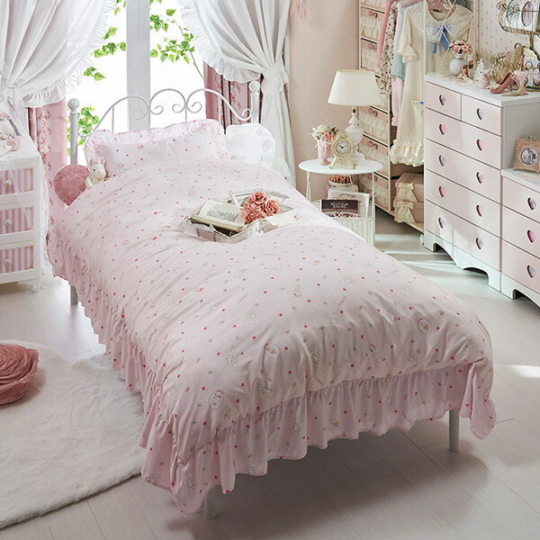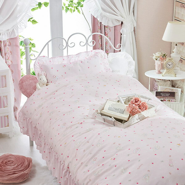 枕カバーは周囲、掛けカバーには3方向にギャザーフリルをあしらい、とびきりラブリーキュートな雰囲気に♪