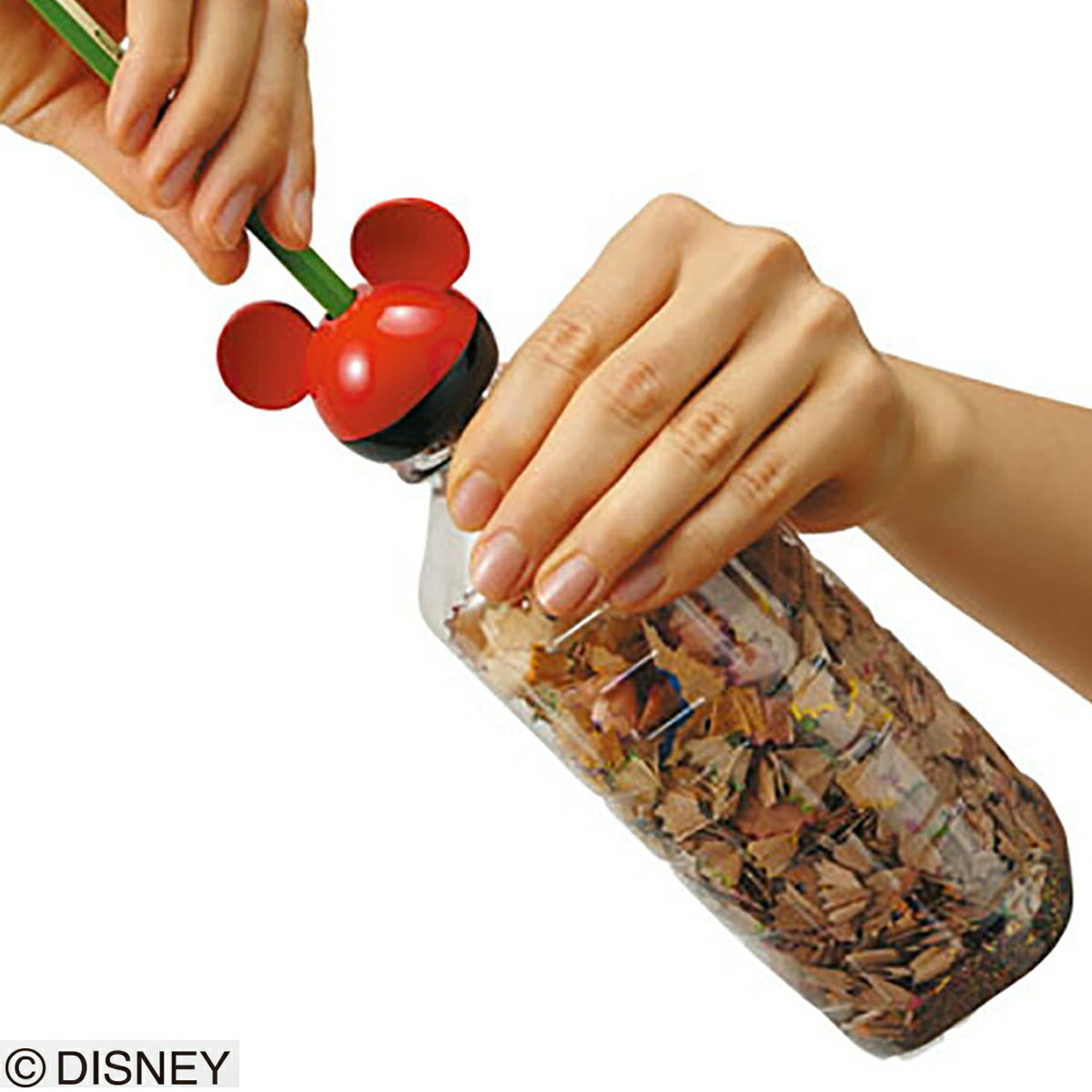 ※空のペットボトルに取り付けるだけで鉛筆削りに! ※飲み終わったペットボトルに取り付けて使う、ミッキーマウスの形のかわいい鉛筆削り。